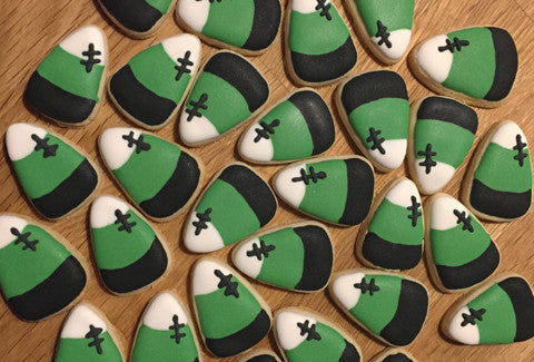Each set comes with 30 (thirty) homemade bite-sized sugar cookies decorated as Frankenstein-inspired candy corns.